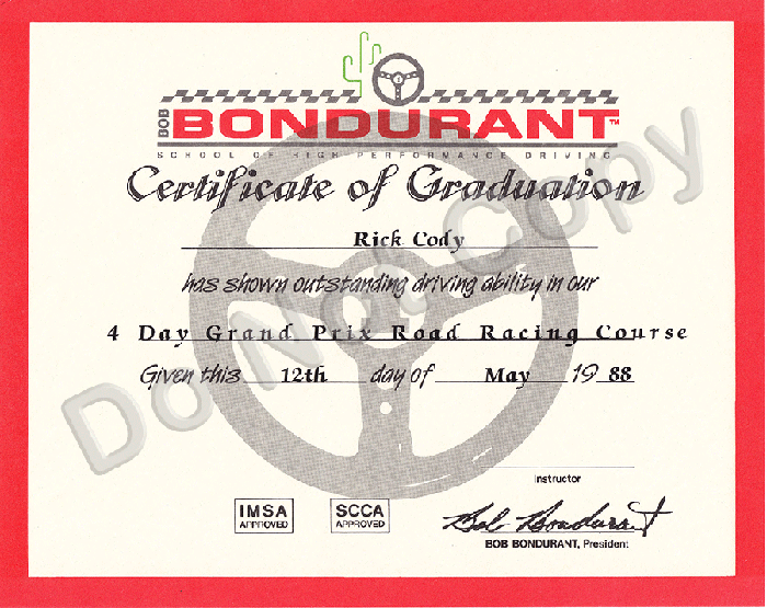 A log book was issued and each day's sessions logged, actual track time noted and a grade given. The school is a first class operation, well run, with excellent equipment the instructors. The instructors just don't go through the motions but really want the student to learn and take the time for those in need. This class was the most valuable experience of my lifetime for car control and confidence in pushing to the limit. If you have an interest in becoming a better/faster driver, consider a high performance driving course from Bondurant, you won't be sorry.